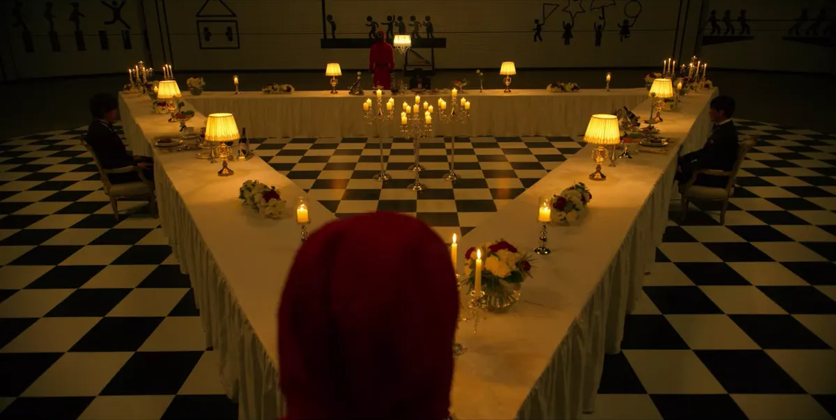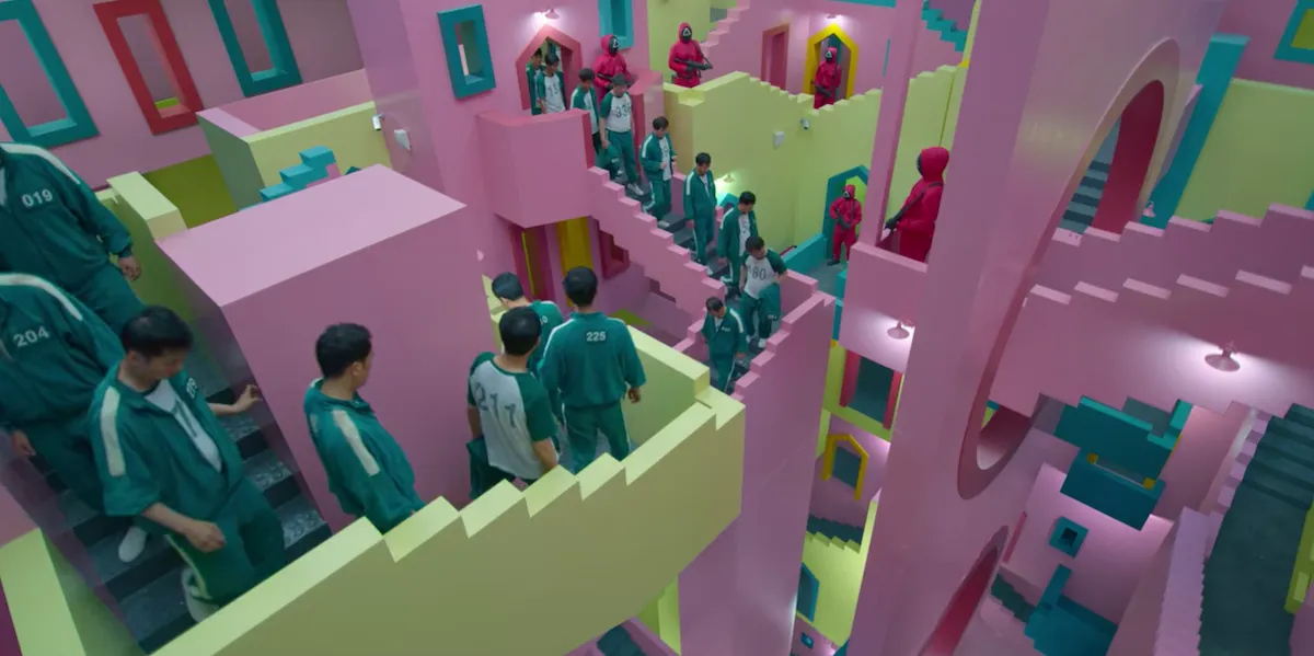 게임 참여자들이 오가는 이 장면에서 MC 에셔 M.C. Escher의 판화 <상대성>(1953)을 떠올릴 수 있죠. 워낙 유명한 작품이고, 오징어 게임의 미술 감독이 영향을 받은 아티스트라고 인터뷰에서 언급하기도 했습니다. 가지런히 움직이고 있는 참가자의 모습은 생각이나 감정이 제거된 기계적인 움직임을 보여줍니다. 에셔의 판화 속에서 얼굴이 지워진 인물들이 시작과 끝도 보이지 않는 구조 안에서 갇혀있는 것처럼, 오징어게임 속 인물들은 죽어야 끝나는 게임 속에 갇혀있다는 정서를 전달합니다.