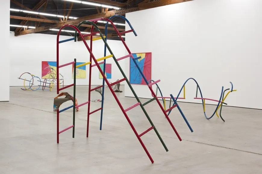 베를린을 거점으로 활동하고 있는 폴란드 출신 아티스트, 프리제멕 피쉬첵 Przemek Pyszczek은 놀이터에서 볼 수 있을 것 같은 다양한 조형물을 제작해왔습니다. 밝고 알록달록한 색상이 칠해진 철제 파이프는 놀이기구를 연상시키는 형태를 띄고 있지만, 안전하게 바닥에 고정되어 있지 않고 불안정하게 존재합니다. 오징어 게임 속 놀이기구들 역시 엄청나게 높은 정글짐이나 미끄럼틀처럼 그 위에 올라가 논다는 것을 상상할 수 없는 불안한 모습으로 등장합니다. 놀이라는 기능을 상실한 기구는 오히려 유희의 위험성을 강조하고, 드라마 속 세계의 불균형을 드러냅니다.