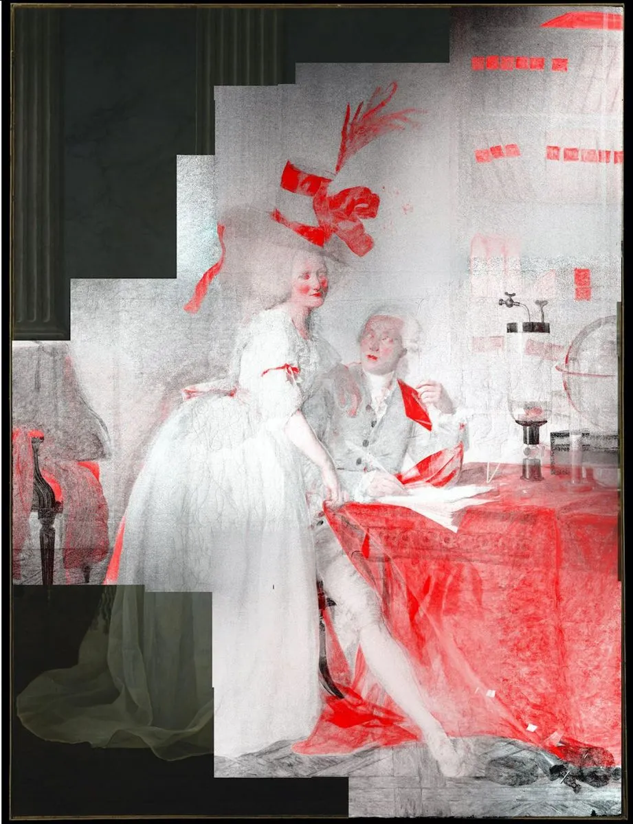 그림 속에서 나를 바라보고 있는 이들이 누구인지 궁금해보신 적 있나요? 이 그림 속의 우아한 남자의 이름은 앙투안 라부아지에입니다. 그의 시선이 부인인 마리 앤 라부아지에를 향하고 있고, 부인은 우리를 정면으로 바라보고 있습니다. 라부아지에 부부는 프랑스의 지배 계급이었던 상류층에 속했습니다. 그들에게는 독특한 취미가 있었습니다. 자택에서 과학 연구와 실험을 했는데요, 그 결과로 산소의 정체를 밝혀내고 여러 가설들을 발표했습니다. 이들이 발표한 가설 중 가장 잘 알려진 것이 바로 질량 보존의 법칙입니다. 이제 기억나시나요? 라부아지에의 질량 보존의 법칙? 이 두 사람은 과학사에 길이 남을 불후의 과학자 커플로 기억됩니다. 작품 속 모습이 그런 이미지를 만드는 데 큰 역할을 했지요. 공간은 간소하게 표현되었고, 그들 주변에는 반짝이는 과학실험 도구들이 놓여있어 그들의 관심사가 무엇이었는지 드러내고 있죠. 하지만 소장처인 메트로폴리탄 미술관 복원팀이 최종적으로 완성된 그림의 층 아래에 존재하는 다른 그림을 발견했습니다. 그 발견에 대한 연구 결과를 9월 1일에 발표해 관심을 모았습니다.
