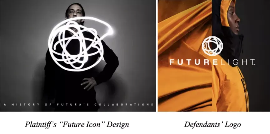 노스페이스는 2019년에 방수기능을 강조한 라인을 선보이면서 새로 디자인한 '퓨처라이트' 로고를 중심으로 캠페인을 벌였습니다. 약 230억 원이 투입된 캠페인으로 제품은 성공적으로 판매를 이어갔습니다. 그런데 동시에 스트리트 아티스트 퓨추라에게 메세지가 쏟아졌습니다. 노스페이스의 새 로고를 두고 협업을 한 것이 맞냐는 질문이었는데요. 퓨추라는 퓨쳐라이트 로고를 보고 자신의 시그니쳐인 '원자 atom' 이미지와 강한 유사점을 발견했습니다. (위의 사진 참고) 노스페이스가 로고 뿐만아니라 의도적으로 자신의 참여를 연상시키는 '퓨처라이트'라는 명칭을 사용했다고 생각하게 됩니다. 노스페이스 측에 항의했지만 인정되지 않았고 합의가 이루어지지 않았습니다. 결국 상표권 침해로 사안을 캘리포니아 법정으로 가져간 것이 올해 1월의 일입니다.
